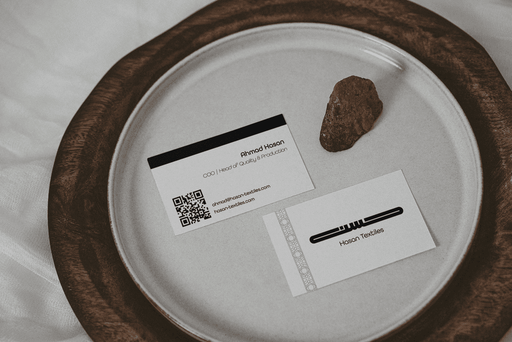 Die Visitenkarten von Hasan Textiles verbinden modernen Minimalismus mit dem eigens entwickelten Markenmuster und vermitteln damit bereits im ersten Eindruck die Identität des Unternehmens. Klare Typografie, viel Weißraum und eine reduzierte Gestaltung sorgen für Professionalität und Eleganz, während das subtile arabisch inspirierte Pattern Wärme, Herkunft und Geschichte transportiert.
