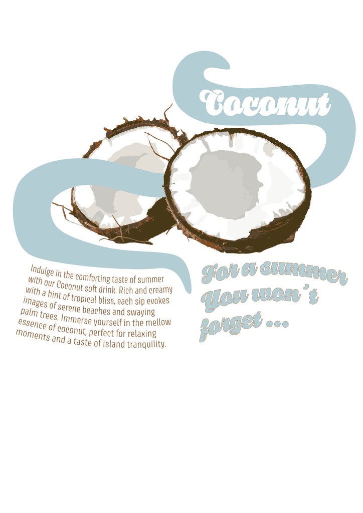 Sanfte Blautöne, geschwungene Linien und eine ruhige, luftige Komposition transportieren ein Gefühl von Strand, Entspannung und tropischem Minimalismus. Die Kokosnuss-Illustration steht im Zentrum einer entspannten, warmen Sommeratmosphäre.