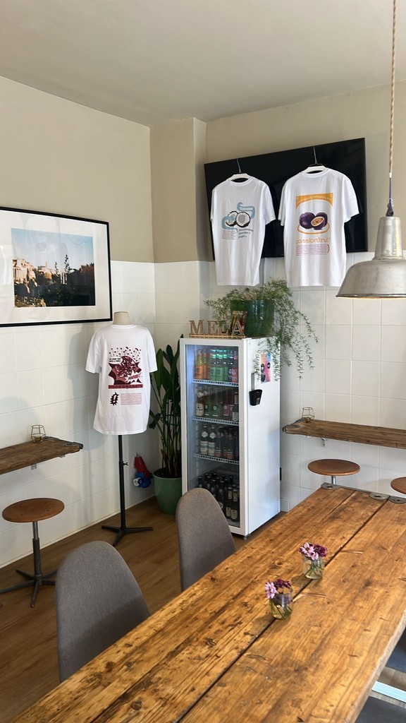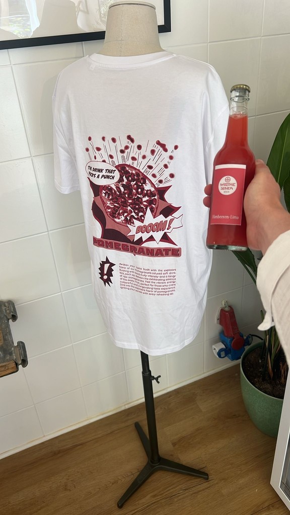 Das Verkaufskonzept verbindet die Kleidung direkt mit einem passenden Geschmackserlebnis. In kleinen Läden und vor allem Cafés werden Drinks angeboten, die entweder die gleiche Frucht wie das Shirt enthalten oder denselben „Vibe“ tragen – frisch, tropisch, spritzig oder cremig. So entsteht ein spielerischer, sofort verständlicher Bezug zwischen Design und Getränk. Das Konzept macht die Marke erlebbar, stärkt den Wiedererkennungswert und schafft ein kleines, sinnliches Erlebnis am Verkaufsort.