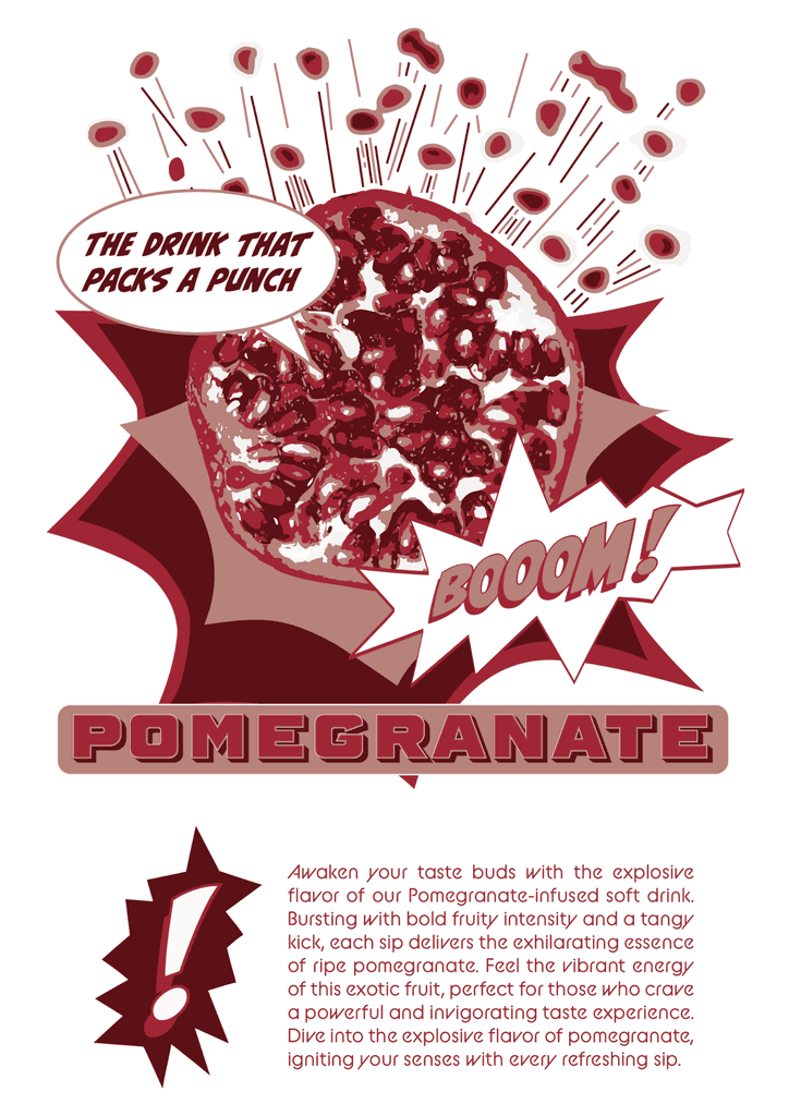 Knallige Comic-Ästhetik, Explosionseffekte und dynamische Typografie vermitteln die kraftvolle, energiegeladene Intensität des Granatapfels. Das Motiv wirkt laut, impulsiv und voller „Punch“ – passend zur spritzigen Geschmacksnote.